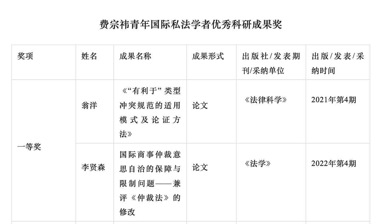 由中国国际私法学会组织评选的“费宗祎青年国际私法优秀学术成果奖”揭晓,法学院助理教授李贤森在《法学》(CLSCI)刊发的《国际商事仲裁意思自治的保障与限制问题——兼评仲裁法的修改》一文获评一等奖。“费宗祎青年国际私法优秀学术成果奖”是中国国际法学界对青年学者的最高奖项。此次,李贤森助理教授的研究成果获得一等奖,为中国国际法学科和学术繁荣发展贡献了自己的力量,并极大增强了北京理工大学法学院在中国国际法学科中的美誉度与影响力。