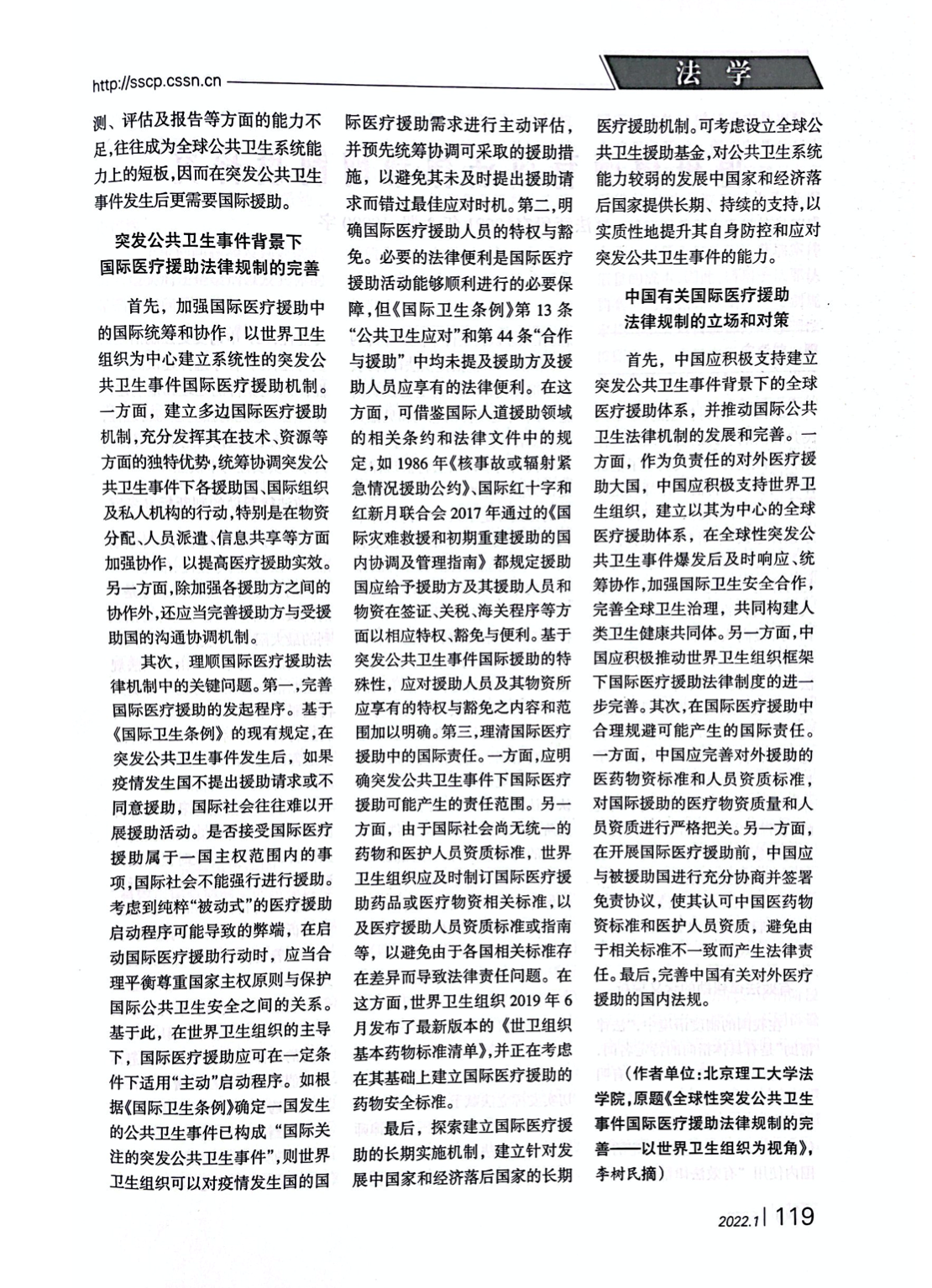 《全球性突发公共卫生事件国际医疗援助的法律规制》一文原载于《北京理工大学学报(社会科学版)》2021年第5期,原题为《全球性突发公共卫生事件国际医疗援助法律规制的完善——以世界卫生组织为视角》。论文认为,全球性突发公共卫生事件相继爆发对国际公共卫生安全带来严重威胁和挑战。国际医疗援助对于应对突发公共事件具有重要意义,也是国际卫生合作和治理中不可或缺的重要环节。但现行国际卫生法律制度对于国际医疗援助尚无系统性的法律规制,并存在诸多缺陷。对此,应在世界卫生组织框架下加强国际医疗援助中的国际统筹和协作,以其为中心建立突发公共卫生事件国际医疗援助机制,同时完善国际医疗援助的发起程序,明确援助人员的特权与豁免,理清国际医疗援助中的国际责任,建立针对发展中国家的长期援助机制。作为对外医疗援助大国,中国应积极推动突发公共卫生事件国际医疗援助法律制度的进一步发展和完善,在国际医疗援助中合理规避法律责任,同时完善对外医疗援助方面的国内法规,推动构建人类卫生健康共同体。