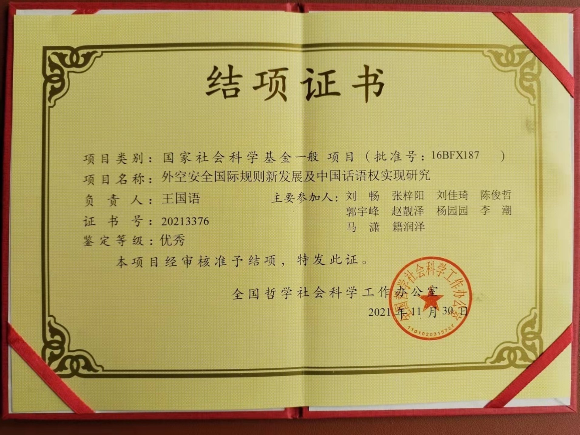 我院王国语副教授主持的国家社会科学基金一般项目《外空安全国际规则新发展及中国话语权实现研究》(16BFX187)顺利通过结项评审,鉴定等级为优秀,是我校“十三五”国家社科基金两项结项优秀的项目之一。