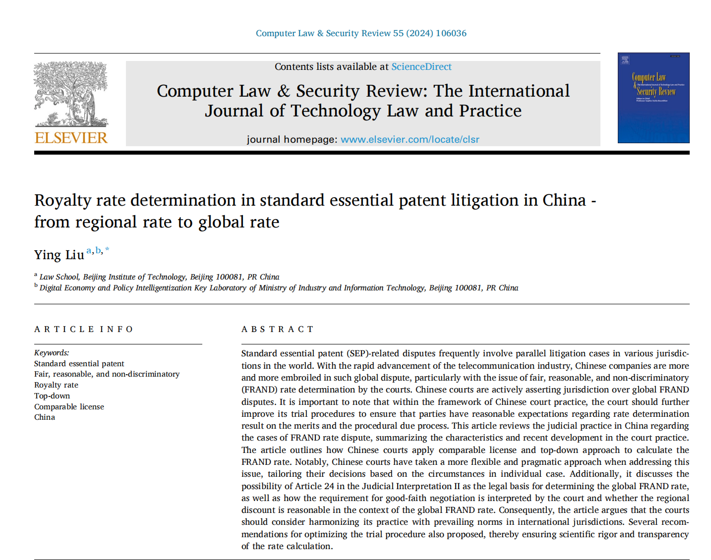 近日,北京理工大学法学院助理教授刘影在国际著名期刊《计算机法与安全评论》(Computer Law & Security Review,CLSR)2024年第55卷发表学术论文《中国标准必要专利诉讼中专利使用费的确定——从地区费率到全球费率》(Royalty rate determination in standard essential patent litigation in China - from regional rate to global rate)。本篇论文是刘影老师主持的国家社科基金一般项目(23BGL075)的重要阶段性成果。