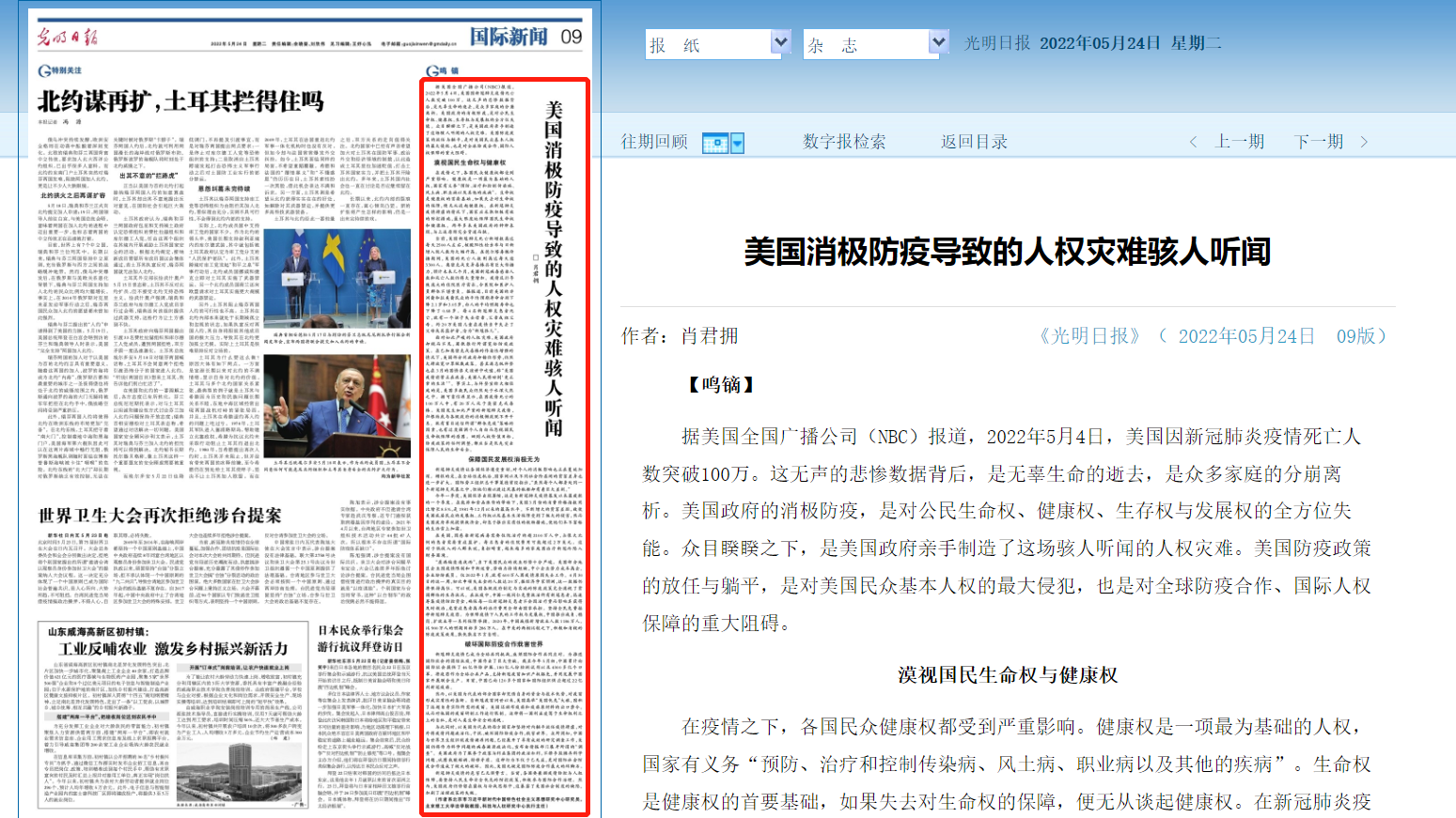 据美国全国广播公司(NBC)报道,2022年5月4日,美国因新冠肺炎疫情死亡人数突破100万。这无声的悲惨数据背后,是无辜生命的逝去,是众多家庭的分崩离析。美国政府的消极防疫,是对公民生命权、健康权、生存权与发展权的全方位失能。众目睽睽之下,是美国政府亲手制造了这场骇人听闻的人权灾难。美国防疫政策的放任与躺平,是对美国民众基本人权的最大侵犯,也是对全球防疫合作、国际人权保障的重大阻碍。