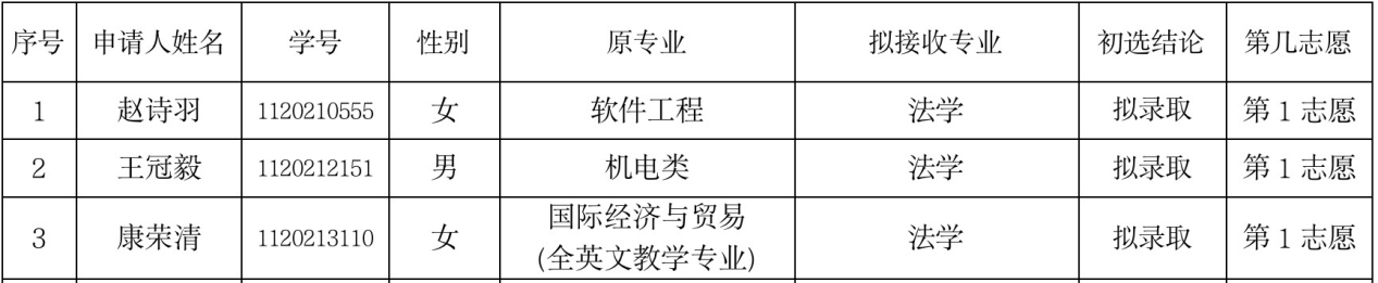 根据《北京理工大学本科生管理规定》、《北京理工大学本科生学籍管理细则》和教务部关于2022-2023学年第二学期转专业安排的相关规定,法学院严格按照上述文件规定执行,现对最终结果进行公示: