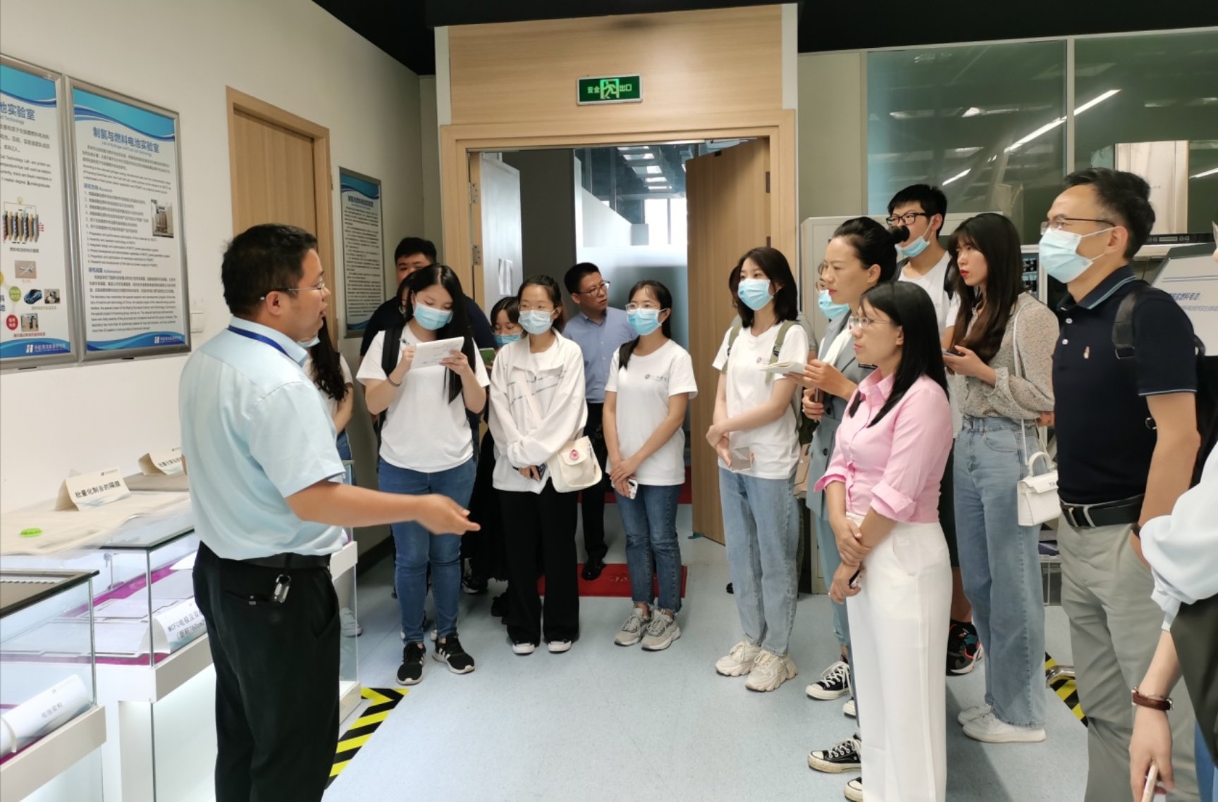 随后,工作人员带领调研师生前往两个与氢能研究密切相关的实验室。第一个实验室是“制氢与燃料电池实验室”。在实验室中,工作人员向调研师生详细讲解了氢能源的在大型机器和小型机器上的不同用途、燃料电池的分类和特点、制氢途径并向调研师生展示了华能清能院的自主创新成果:熔融碳酸盐燃料电池堆组装及运营技术、大面积电极制备技术和大面积环保型水基隔膜制备技术等。调研师生可以直观接触到质子交换膜燃料电池发电系统、5kW和 10kW熔融碳酸盐燃料电池堆,亲眼见证了实验室制膜过程。工作人员耐心地为调研师生答疑解惑,师生对制氢过程有了更深刻的认识。