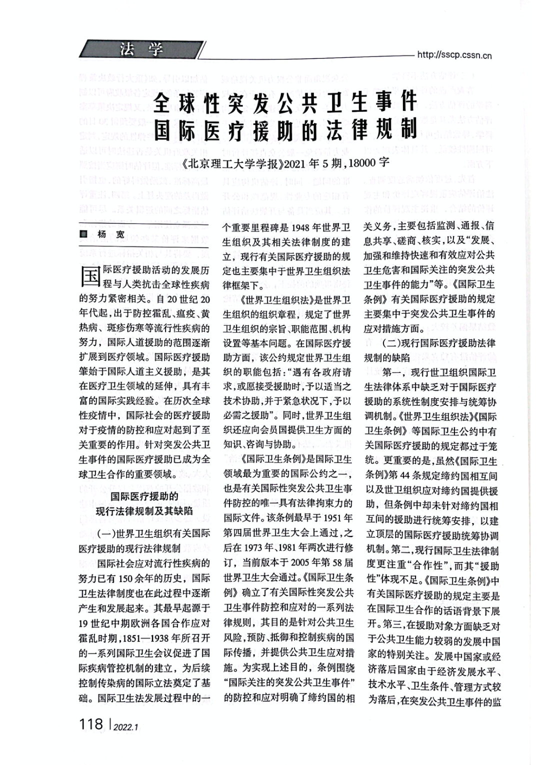 近日,法学院青年教师杨宽所著论文《全球性突发公共卫生事件国际医疗援助的法律规制》被《中国社会科学文摘》2022年第1期转载。