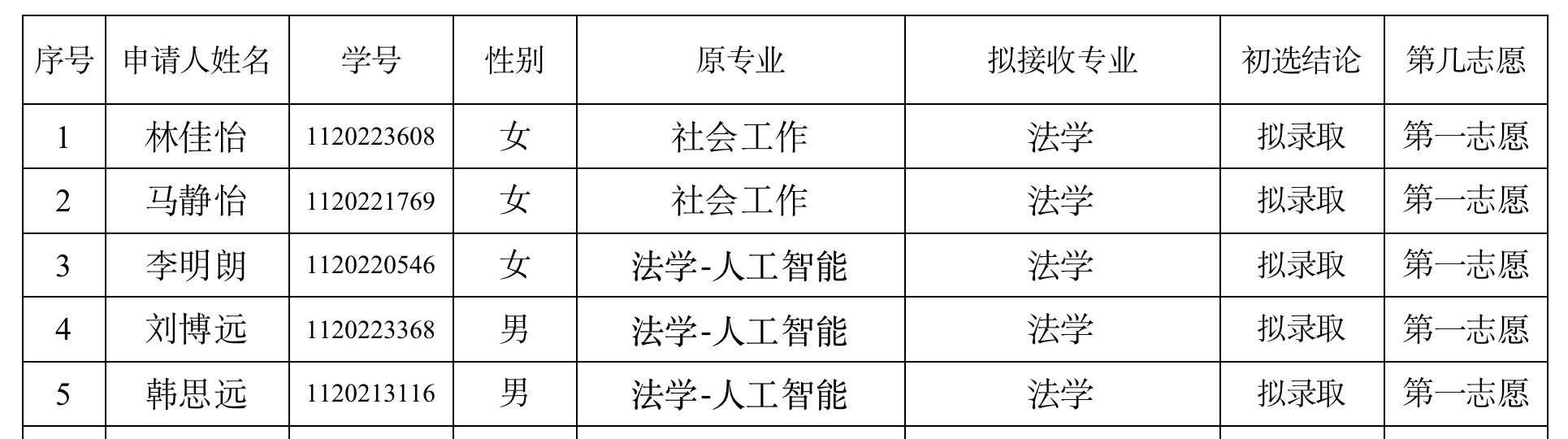 根据《北京理工大学本科生管理规定》、《北京理工大学本科生学籍管理细则》和教务部关于2023-2024学年第一学期转专业安排的相关规定,法学院严格按照上述文件规定,对提交转专业申请的同学进行资料审核,我院拟接收5名转专业学生,现对初选结果进行公示: