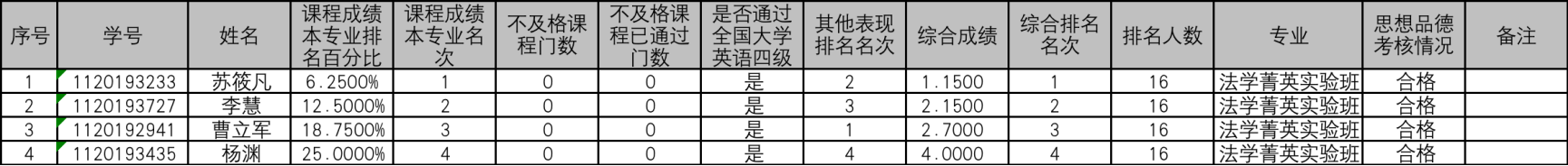 根据教育部《关于进一步规范和加强推荐优秀应届本科毕业生免试攻读研究生工作的通知》(教学厅函【2020】12号)等推免工作文件精神,以及《关于做好北京理工大学2023年推荐优秀应届本科毕业生免试攻读研究生工作的通知》的相关规定,执行《北京理工大学法学院2023年推荐免试攻读硕士研究生工作实施细则》,将法学院2023年首批按专业学习成绩和表现综合排序的推荐免试攻读研究生候选人名单公示如下: